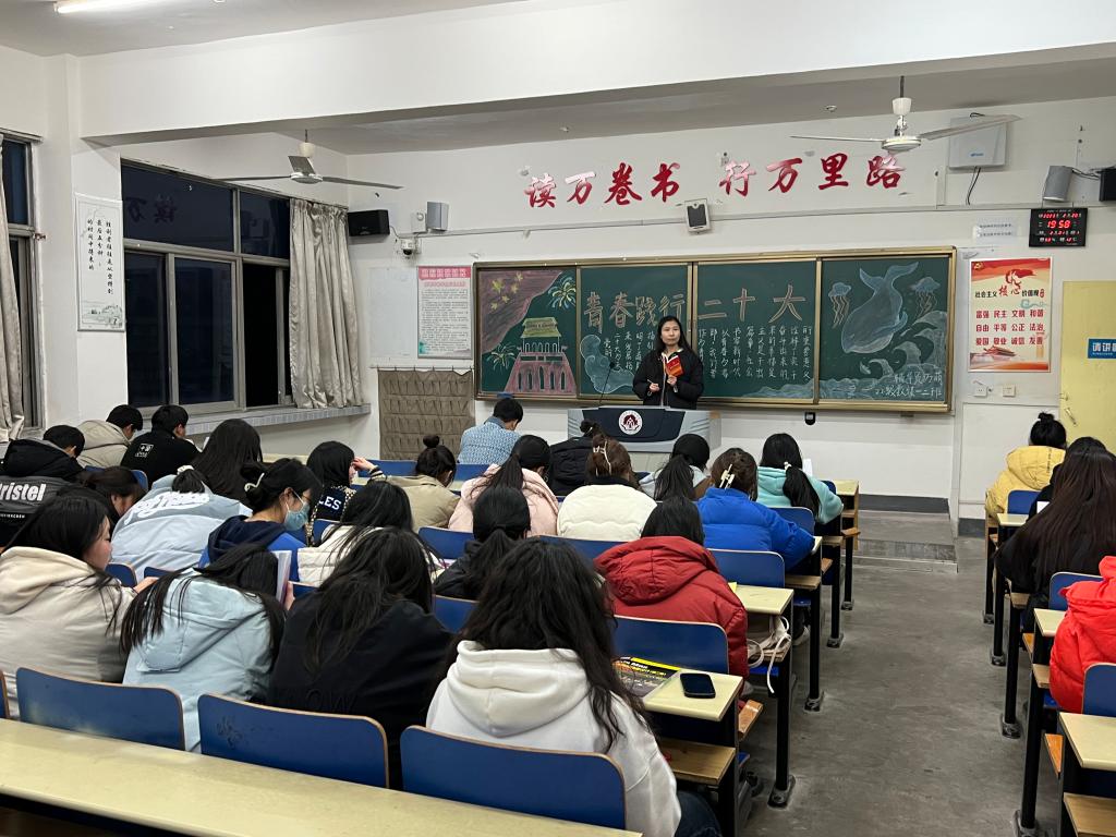 除了以上两个主题之外,22级新生主要召开的是关于青春践行二十大的主题班会,新学期为了顺利开展工作,加强员工思想政治教育,深入学习贯彻党的二十大精神,辅导员带领同学们重温了二十大的重点内容,组织同学们围绕“爱国、奋斗、团结、科学、互助”五个关键词进行讨论,结合自己的寒假社会实践,分享践行二十大精神的感悟。通过同学们的分享,员工对二十大精神有了更加透彻的理解,愿意也更加积极的以实际行为去爱国爱党,展现新时代老员工的风采。